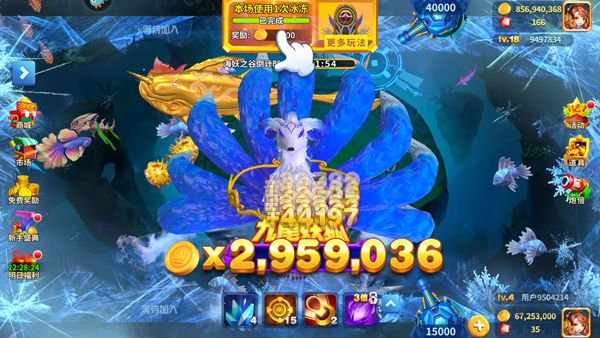 2、炮臺倍數切換:點擊炮臺上的“—”或“+”按鈕來調整炮臺倍數。倍數越高,消耗的金幣越多,但成功捕獲魚類的概率和獎勵也會相應增加。