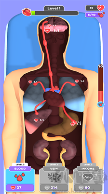 1、玩家需通過(guò)管理血管暢通來(lái)確保血液流動(dòng),幫助各器官獲得充足的血液。