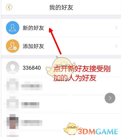4、添加成功后,回到“新的好友”列表,點(diǎn)擊新添加的好友,接受對方的好友請求,這樣即可完成好友添加。