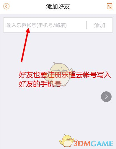 3、在添加好友時(shí),確保該好友已經(jīng)注冊樂橙云賬號,并且使用的是手機(jī)號碼,而非QQ號或微信賬號。輸入手機(jī)號碼后,點(diǎn)擊“添加”;