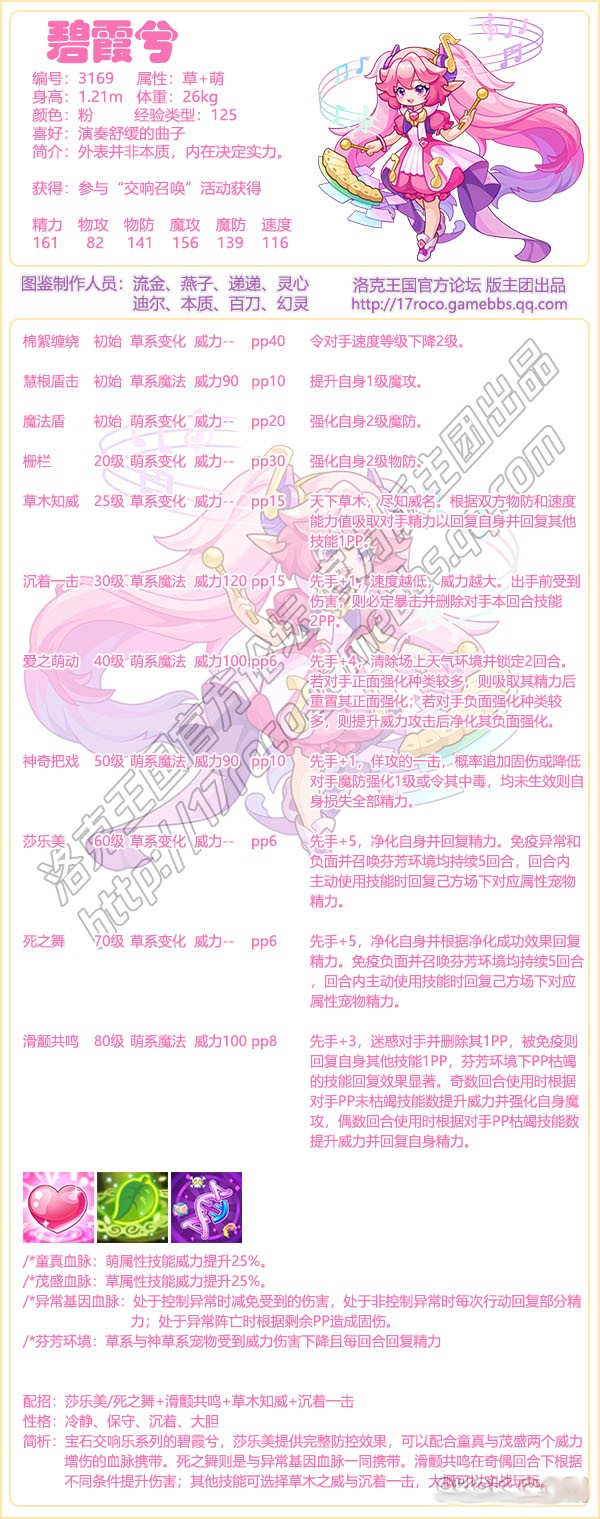 今天為大家?guī)?lái)《洛克王國(guó)》中的碧霞兮技能表圖鑒。這只編號(hào)為3169的魔攻寵物,屬于寶石交響樂(lè)系列的碧霞兮,由莎樂(lè)美提供全面的防控效果。可以與童真和茂盛兩個(gè)增傷血脈搭配使用。死之舞則適合與異?;蜓}組合使用。以下是詳細(xì)的技能表和種族值信息,感興趣的玩家請(qǐng)繼續(xù)閱讀!