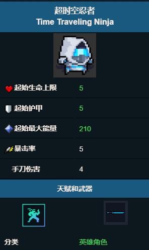 超時空忍者的面板屬性相對平凡,沒有明顯的優(yōu)勢或劣勢。她的被動技能天狗倒提供了短暫的無敵時間,但覆蓋范圍小且可控性差。技能冷卻時間較長,幾乎是技能時間的兩倍,自動觸發(fā),使得關(guān)鍵時刻難以發(fā)揮作用。她的初始武器分子一文字具有較快的攻速和較大的消彈范圍,防御性能也不錯,暴擊率高達(dá)40點(diǎn),保障了角色的基本輸出。然而,該武器的傷害較低,在輸出方面幫助有限。