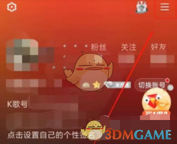 1、首先打開(kāi)全民K歌應(yīng)用,點(diǎn)擊個(gè)人界面右上角的三橫圖標(biāo);