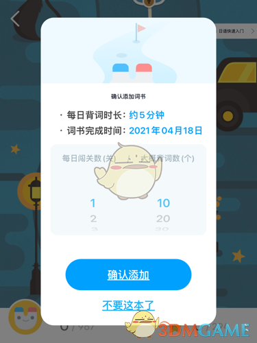 2、進(jìn)入后點(diǎn)擊左上角的返回按鈕,會(huì)彈出確認(rèn)添加詞書(shū)的窗口。在這里,你可以選擇每日的闖關(guān)數(shù)量和背詞數(shù)量。確認(rèn)設(shè)置后,點(diǎn)擊“確認(rèn)添加”按鈕保存詞書(shū)。