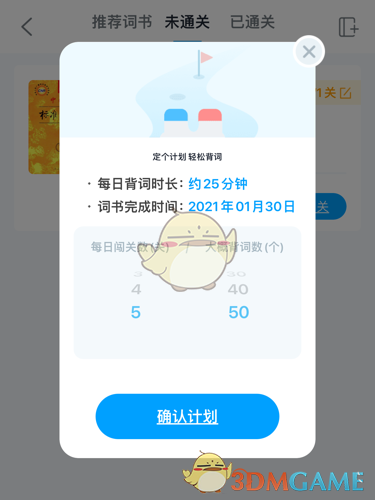 4、點(diǎn)擊詞書(shū)右側(cè)的關(guān)卡數(shù)量按鈕,即可重新設(shè)置每日的闖關(guān)數(shù)和背詞數(shù)。