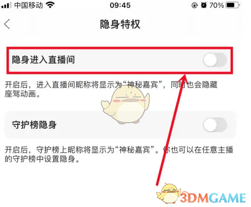4、最后,將“隱身進(jìn)入直播間”選項(xiàng)旁的開關(guān)打開即可。