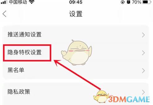 3、在設(shè)置頁面中,選擇“隱身特權(quán)設(shè)置”選項(xiàng)。