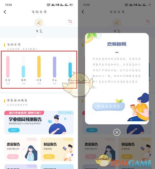 3、在“發(fā)現(xiàn)自我”區(qū)域,你將看到多種分類的柱狀圖。點(diǎn)擊任意一個(gè)柱狀圖,即可查看對(duì)應(yīng)的類別解讀,這些柱狀圖即代表了你的本命星盤解讀。