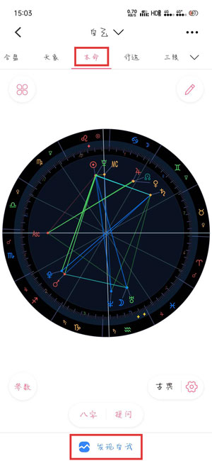 2、進(jìn)入星盤界面后,默認(rèn)顯示的是本命星盤。點(diǎn)擊下方的【發(fā)現(xiàn)自我】按鈕,便可查看本命星盤的詳細(xì)解讀。
