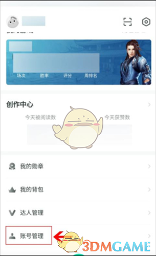 2、在解綁之前,需要點(diǎn)擊右下角的【我的】,進(jìn)入角色頁(yè)面。然后滑動(dòng)頁(yè)面至底部,找到【賬號(hào)管理】并點(diǎn)擊進(jìn)入。