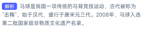 解析:馬球在唐宋元三個朝代較為盛行,到清朝時期逐漸衰退,主要在軍隊和宮廷貴族中流行。目前關(guān)于馬球的起源尚無確鑿證據(jù),但根據(jù)我國文獻記載,馬球運動應(yīng)為本土傳統(tǒng)運動而非外來。2008年6月7日,馬球被國務(wù)院批準(zhǔn)列入第二批國家級非物質(zhì)文化遺產(chǎn)名錄。