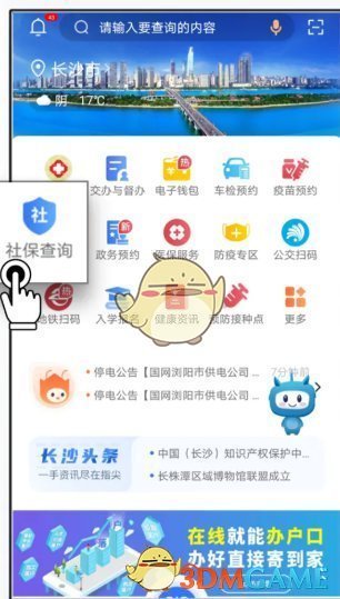 1、下載并登錄“我的長沙”APP后,在首頁服務(wù)窗口中找到【社保查詢】,或在搜索框中輸入【社保查詢】進行搜索并點擊進入。