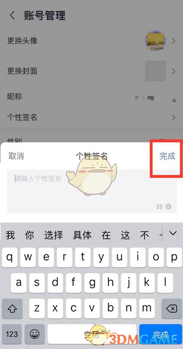 3、在輸入框中鍵入新的個(gè)性簽名,最后點(diǎn)擊右上角的完成按鈕即可。