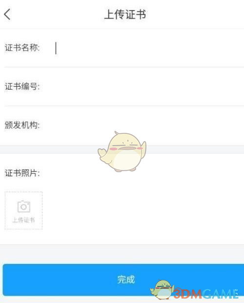 5、接下來(lái),你只需要填寫證書的名稱、編號(hào)和頒發(fā)機(jī)構(gòu)信息,點(diǎn)擊完成按鈕即可完成上傳。