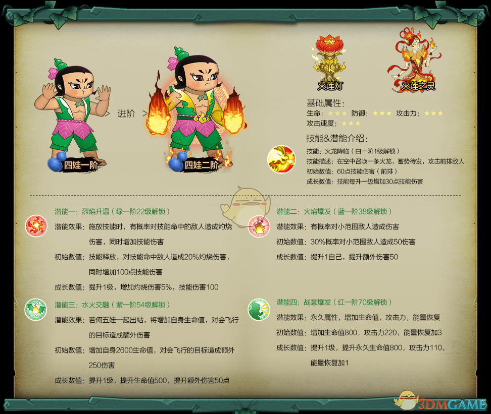 本文將介紹《葫蘆娃》中的四娃,他是七兄弟中的第四個,擁有噴火的能力,并且能承受極高的溫度。作為火娃,他在游戲中的技能輸出也非常強大,表現(xiàn)出色。