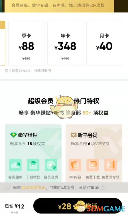 超級會員的開通價格為:連續(xù)包月30元,1個月40元,3個月88元,12個月348元;而豪華綠鉆會員的費用則相對較低,分別為:連續(xù)包月12元,1個月18元,3個月45元,12個月168元。