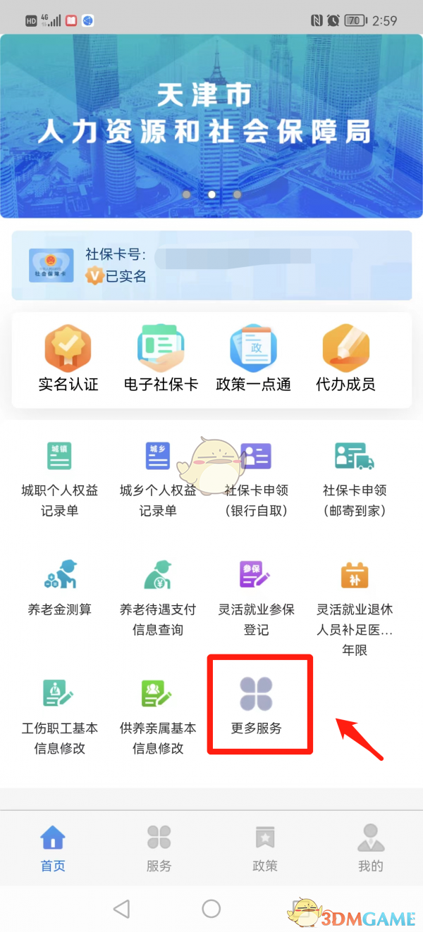 2、點(diǎn)擊“更多服務(wù)”,在其中找到“養(yǎng)老待遇-領(lǐng)取養(yǎng)老待遇資格認(rèn)證”選項(xiàng);