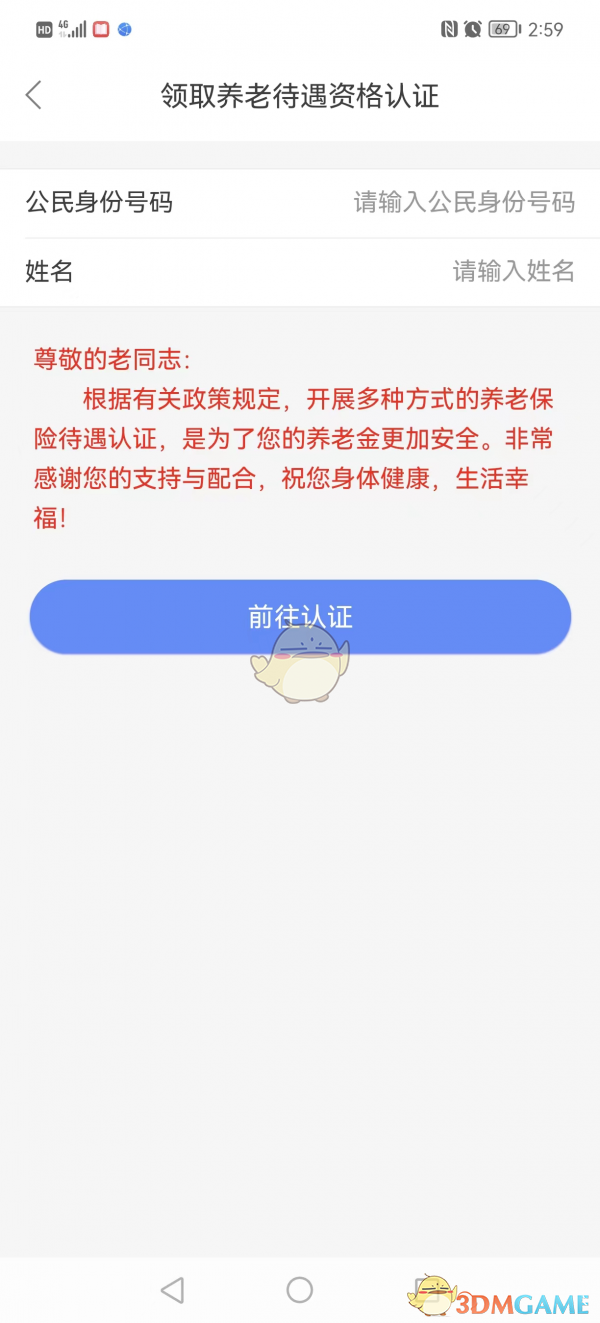 3、點(diǎn)擊進(jìn)入“養(yǎng)老待遇領(lǐng)取資格認(rèn)證”后,系統(tǒng)界面會(huì)顯示,輸入需要認(rèn)證的人員的身份證號(hào)碼和姓名(也可以為他人進(jìn)行認(rèn)證),然后點(diǎn)擊“前往認(rèn)證”: