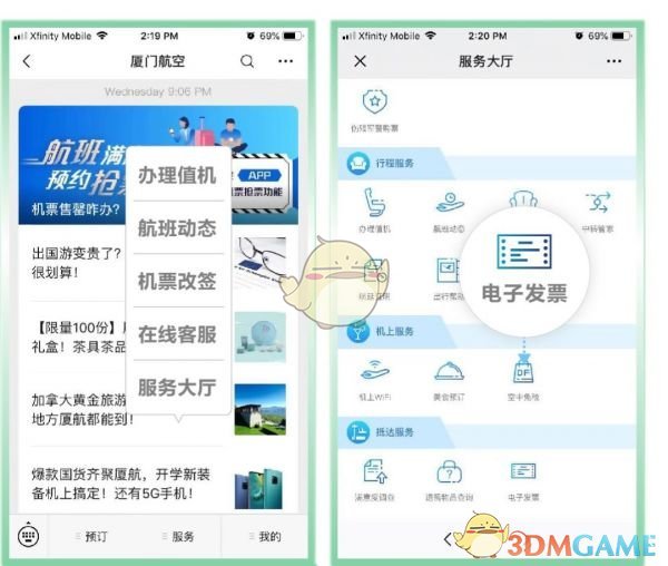 1、打開廈門航空APP,進(jìn)入【服務(wù)大廳】,點(diǎn)擊【電子發(fā)票】。