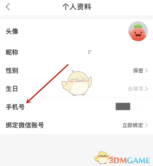 2、在個(gè)人資料頁(yè)面中,點(diǎn)擊【手機(jī)號(hào)】一欄;