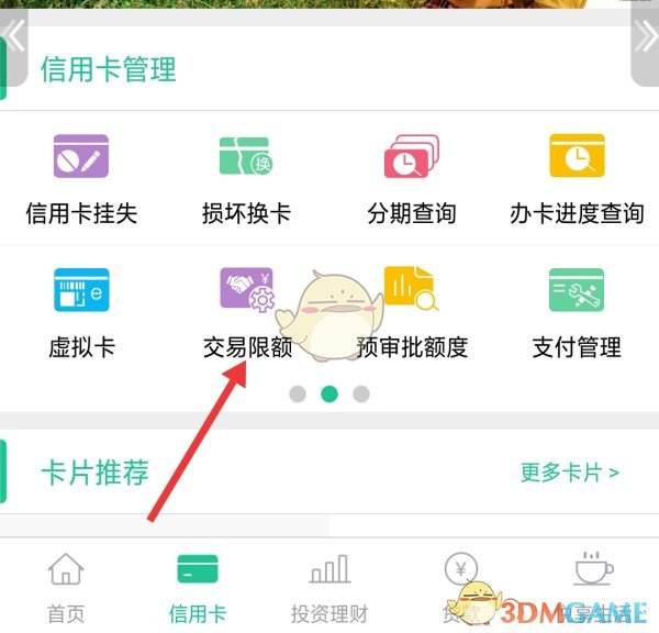 4、在信用卡頁(yè)面,找到并點(diǎn)擊“交易限額”選項(xiàng)。