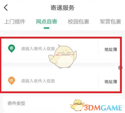 2、在郵寄頁面中,填寫寄件地和收件地的詳細地址。