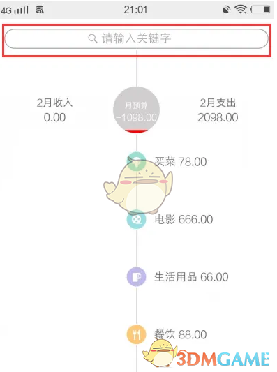 在口袋記賬APP的主界面,向上滑動(dòng)屏幕即可看到一個(gè)搜索框。用戶只需在該框中輸入關(guān)鍵詞(如“買菜”或“房租”等),相關(guān)的賬單記錄會(huì)立刻顯示在下方。這個(gè)功能為用戶提供了快速便捷的賬單查找體驗(yàn),幫助用戶輕松找到所需的賬單信息。