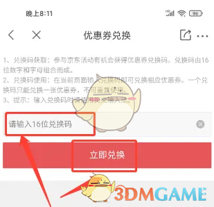 4、進(jìn)入兌換頁面后,輸入兌換碼并點(diǎn)擊【立即兌換】按鈕。