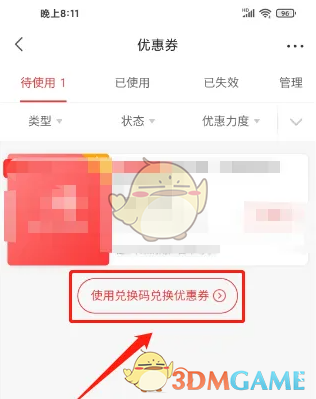 3、在優(yōu)惠券頁面中,點(diǎn)擊【使用兌換碼兌換優(yōu)惠券】。