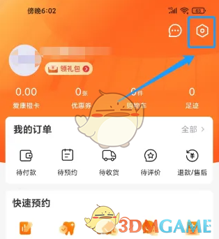 1、打開愛康A(chǔ)PP,進(jìn)入“我的”頁面并點(diǎn)擊右上角的【設(shè)置圖標(biāo)】。