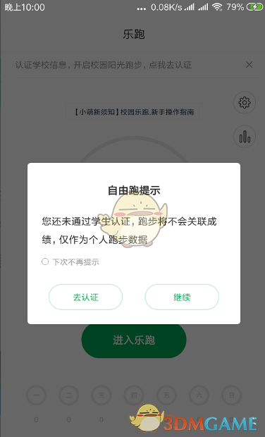4、接下來,需要進(jìn)行學(xué)生身份認(rèn)證,否則將無法記錄有效的計(jì)次數(shù)據(jù),只能作為個(gè)人的跑步記錄。