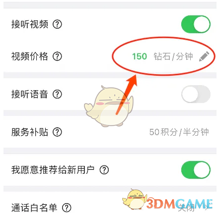 3、最后,進(jìn)入聊天設(shè)置頁(yè)面,找到【視頻價(jià)格】選項(xiàng),在這里您可以調(diào)整設(shè)置視頻通話所需的鉆石數(shù)目。