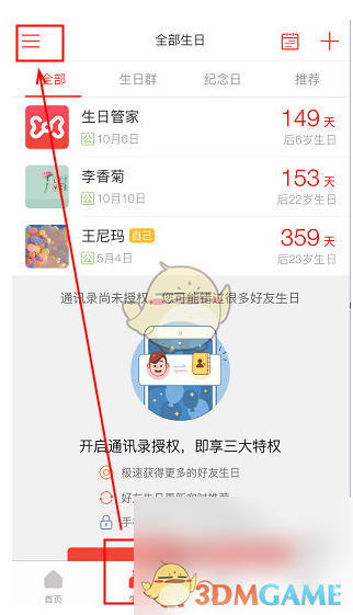 1、首先打開生日管家應(yīng)用,點擊“生日”選項,接著點擊左上角的菜單按鈕;