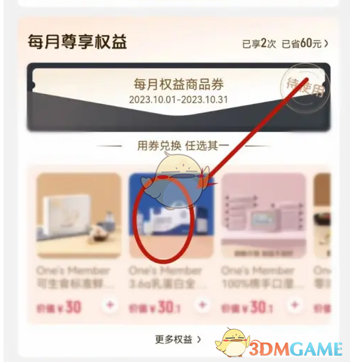 2、在會(huì)員中心頁(yè)面,找到每月尊享權(quán)益中的牛奶商品,點(diǎn)擊進(jìn)入查看。