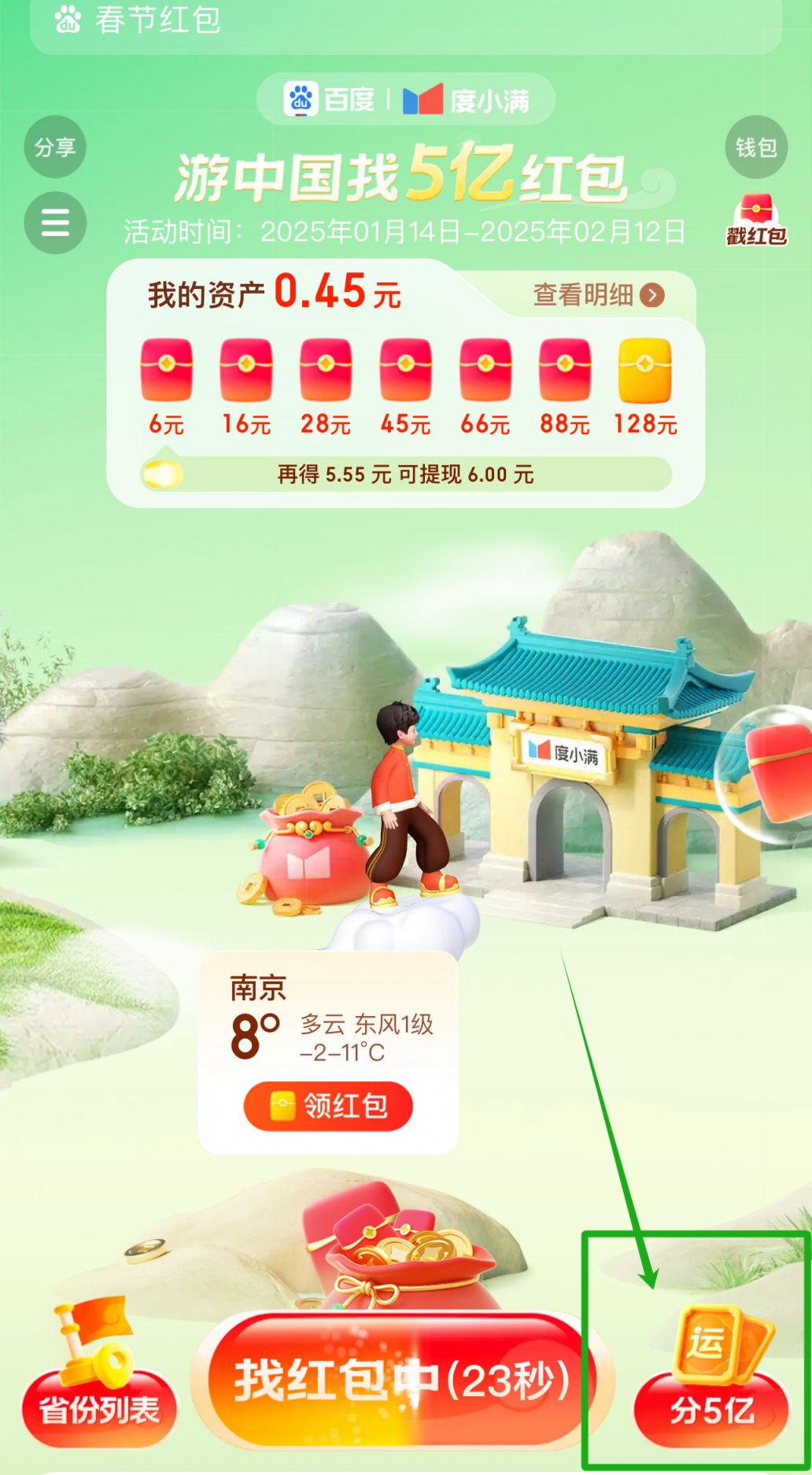 在百度搜索框中輸入【云游中國】、【百度集卡】、【好運中國年】等關(guān)鍵詞,即可進入領(lǐng)取紅包并集卡的頁面!