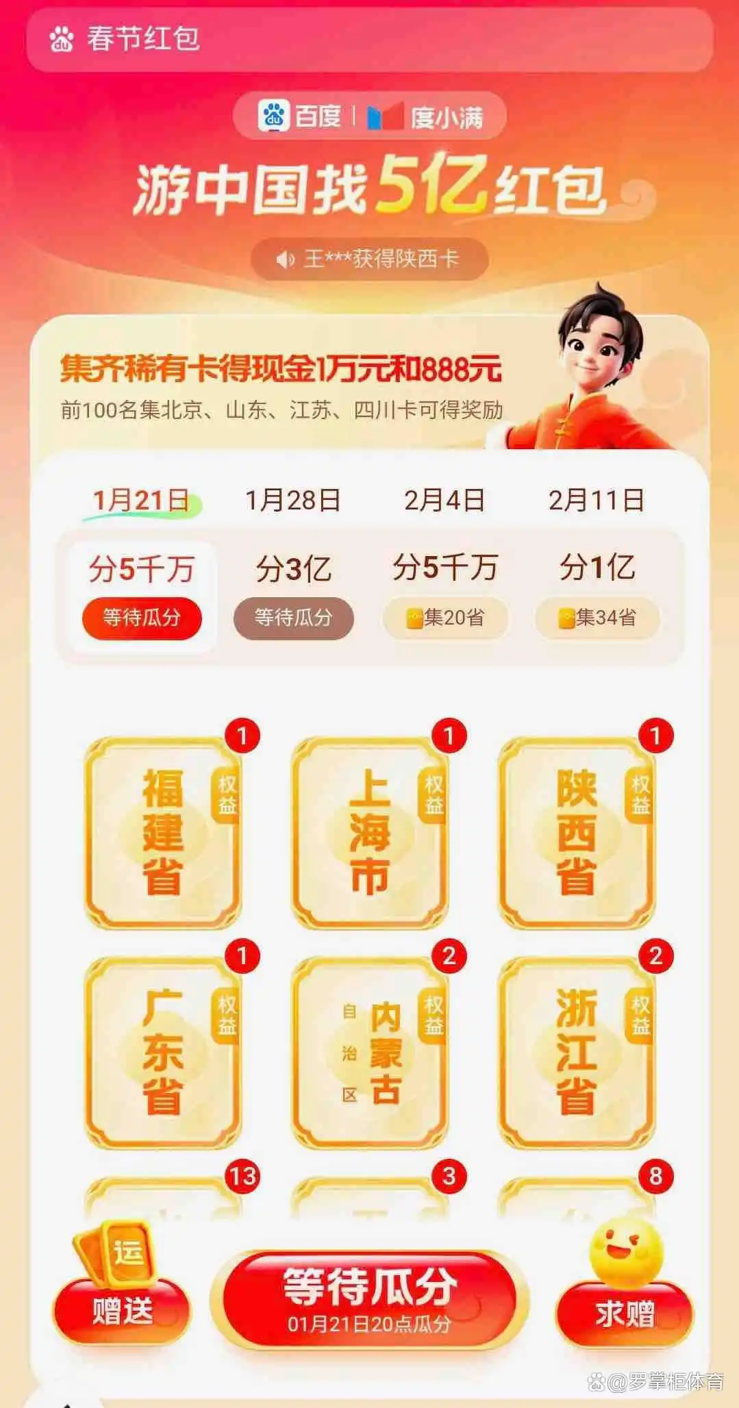 3. 集稀有卡:在特定階段,集齊“北京、四川、江蘇、山東”省卡的用戶,將有機會獲得1萬元現(xiàn)金紅包獎勵,數(shù)量有限,先到先得。
