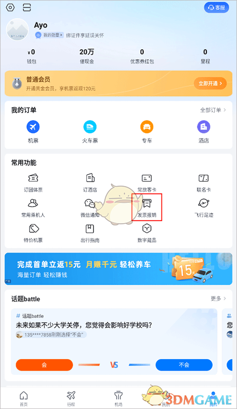 1、進(jìn)入航班管家個人中心,點擊“發(fā)票報銷”選項。