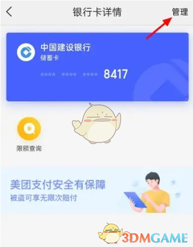4、進(jìn)入該銀行卡的詳情頁后,點(diǎn)擊右上角的“管理”按鈕。