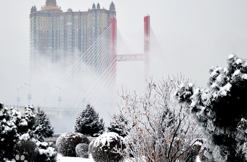 吉林市有一條貫穿城市的松花江,沿江的十里長堤,蒼松林立,楊柳低垂。在特定的氣壓、風(fēng)向、溫度和濕度等條件下,霧氣與水蒸氣在寒冷的氣候中凝結(jié)在樹枝上,形成了霧凇的美麗景象。