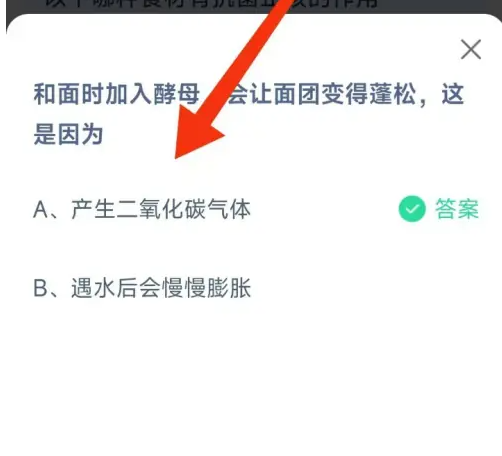和面時加入酵母,面團會變得松軟,這背后是什么原因呢?這是支付寶螞蟻莊園12月26日的每日題目,答對題目可以獲得180g飼料,這對喂養(yǎng)小雞非常重要。接下來為大家?guī)泶鸢福兔鏁r加入酵母讓面團變蓬松,是因為酵母在發(fā)酵過程中會釋放二氧化碳氣體。