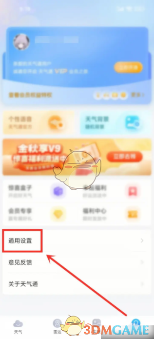 1、首先打開天氣通APP的首頁,點擊【通用設(shè)置】選項。