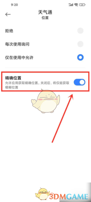 4、進入位置權(quán)限頁面后,啟用【精確位置】選項即可。