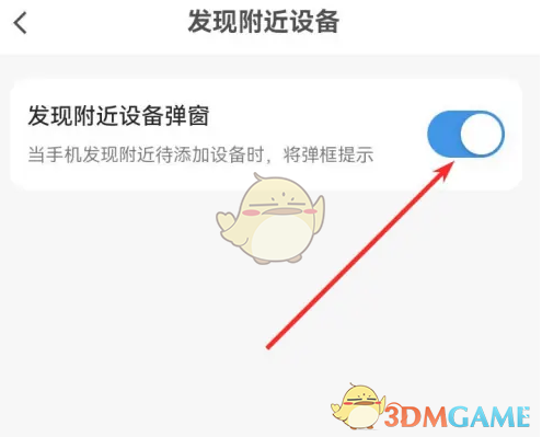4、進入該頁面后,找到“發(fā)現(xiàn)附近設(shè)備彈窗”并點擊后面的滑動開關(guān),將其關(guān)閉。