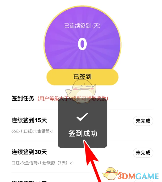 4、系統(tǒng)會(huì)彈出【簽到成功】的提示,表示簽到已完成。