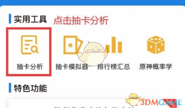 1、首先,進(jìn)入提瓦特小助手首頁(yè),找到“實(shí)用工具”欄目并點(diǎn)擊其中的“抽卡分析”選項(xiàng)。
