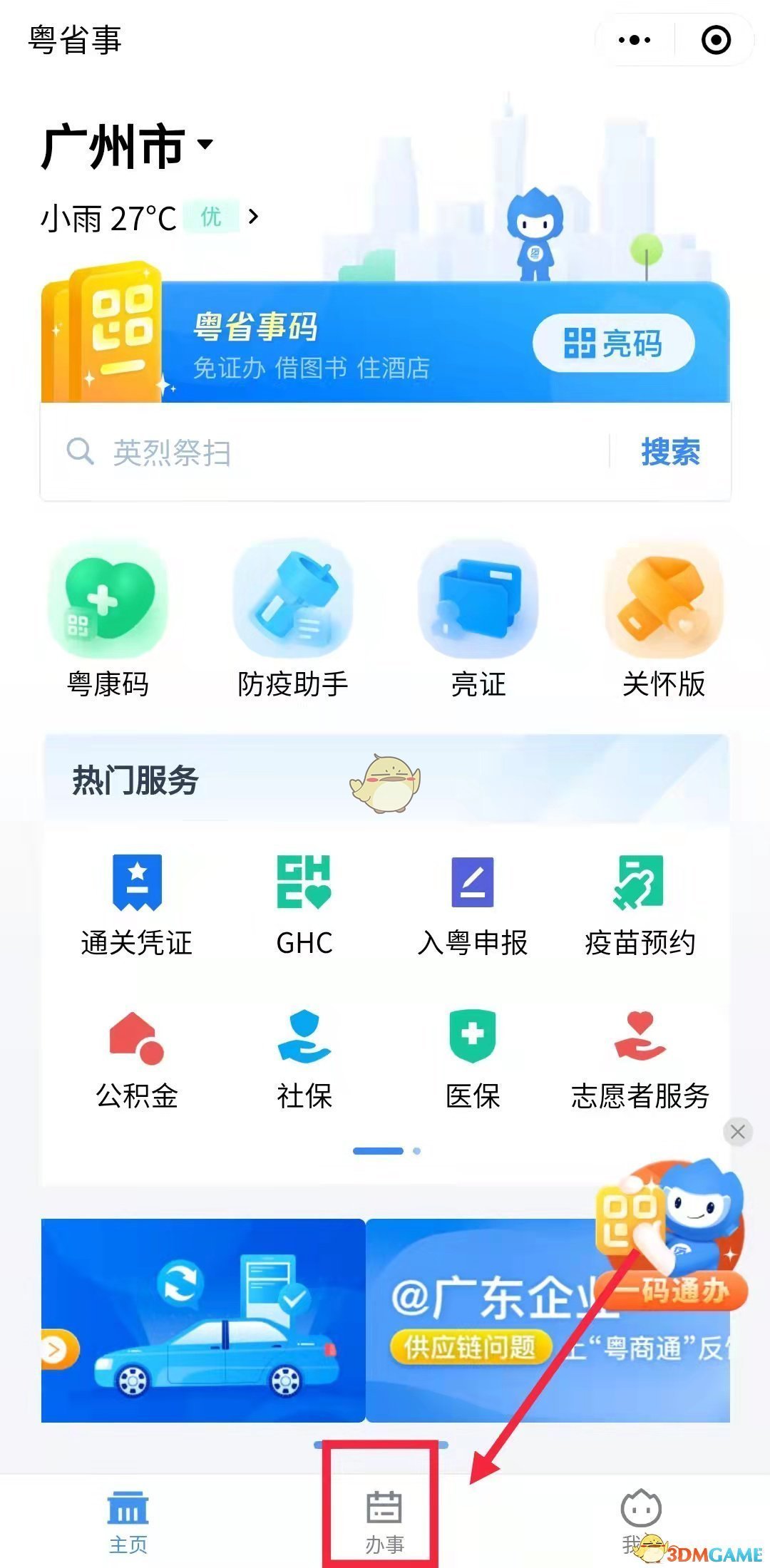 1、首先,進行實名認(rèn)證并登錄粵省事小程序,進入【辦事】欄目,如下圖所示: