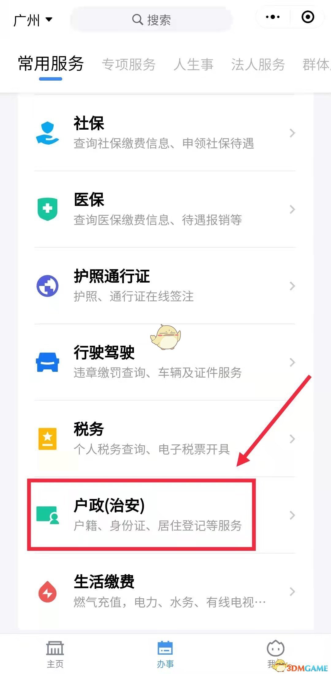 2、在【辦事】欄目中,找到【戶政(治安)】選項,點擊進入,如下圖所示: