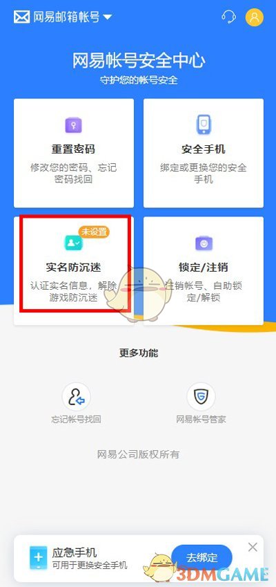 1、首先登錄網(wǎng)易郵箱賬戶,并進(jìn)入安全中心,找到【實(shí)名防沉迷】選項(xiàng)。