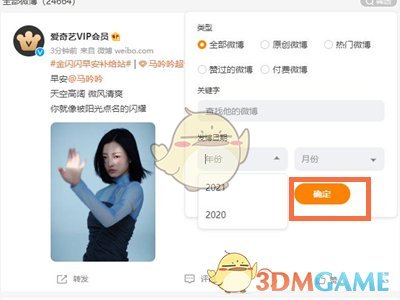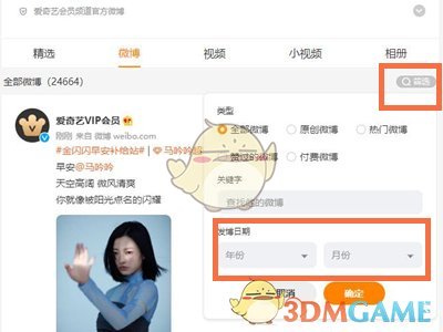 2、在篩選框中選擇具體的年份和月份,點(diǎn)擊確認(rèn)后即可瀏覽對(duì)應(yīng)時(shí)間段內(nèi)的微博內(nèi)容。