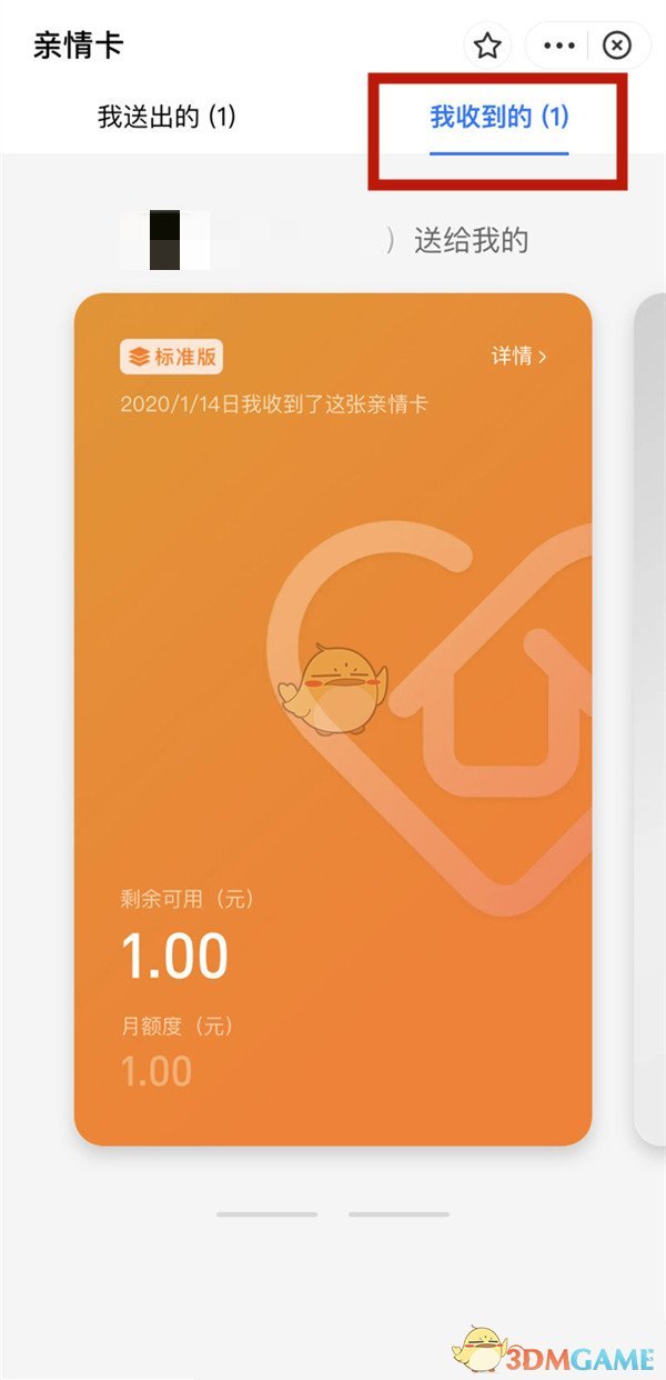 2、進入后,點擊【我收到的】選項,進入親情卡的詳細信息頁面。